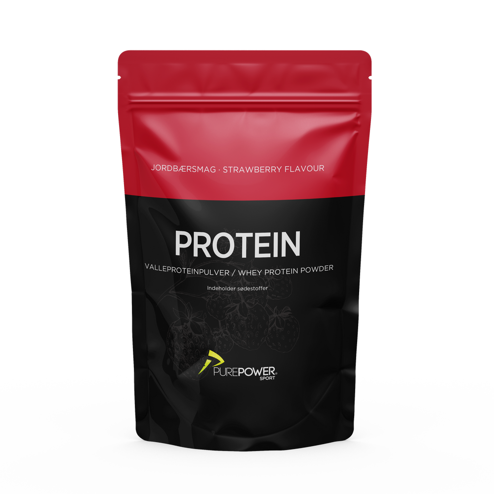 Med vores Proteinpulver får du et effektivt tilskud af valleprotein med lækker jordbærsmag. Pulveret kan blades i smoothies, skyr, mælk eller vand.